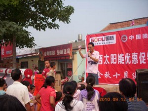 九月份,国普太阳能临淄专卖店—分店开业之际,在总代理吴经理精心策划和国普太阳能区域经理邴树伟经理的大力支持下,开展了一系列的形式多样的促销活动,车队高音喇叭宣传,张贴海报,悬挂条幅,夜场促销演出,有礼销售,购机抽奖等等老百姓喜闻乐见的宣传促销活动,国普太阳能活动不仅仅起到了良好的品牌宣传效果,并且活动中就达到了销售20余台的效果,并且订机意向强烈的也有10余台。这为国普太阳能在临淄地区的销售和普及,以及新专营店经营活动的奠定了良好的基础。